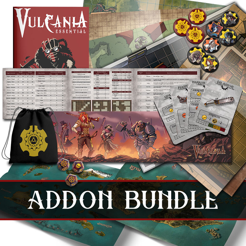 - Map&token pack (2 mappe del mondo con mappe di aeronavi stampate sul retro, 4 cartoncini A3 a doppia faccia con 8 mappe tattiche, pedine PG e ingranaggi del fato)